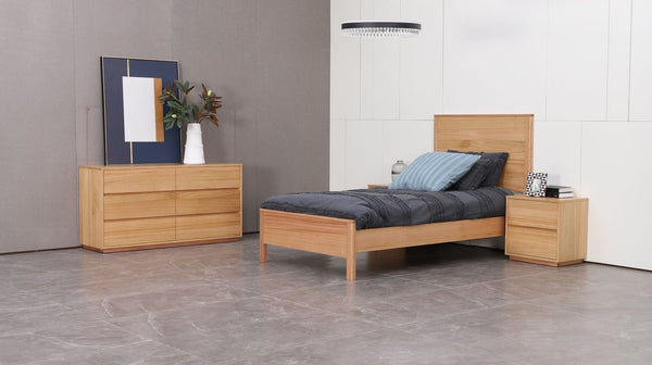 Made from the highly featured messmate & messmate veneers. Cleo brings mother natures artwork into your home. Featuring a taller shelf style bedhead which suits today's deeper style mattresses. Easy to use extension runners & solid drawer bottoms on the furniture to add strength.